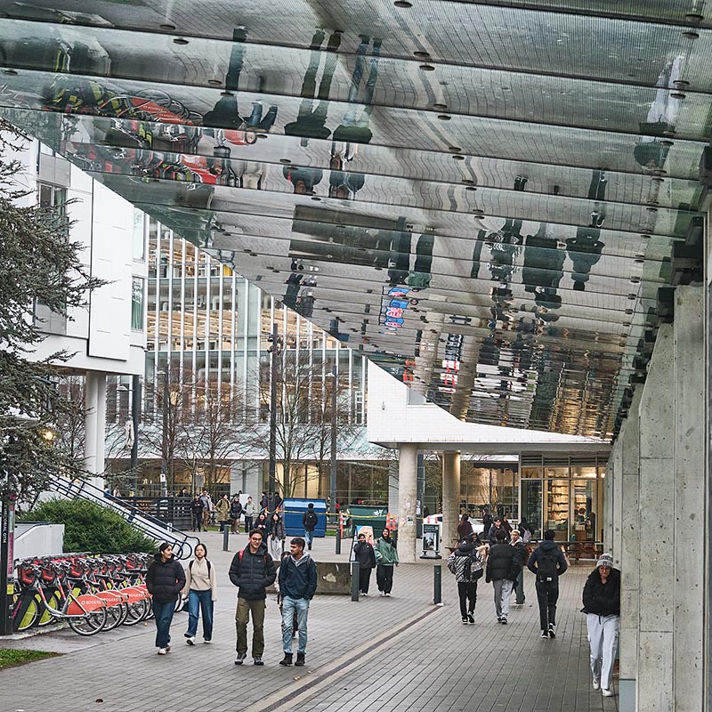November 21st, 2025 — Pedestrians reflected in the the glass above the walkway next to Thunderbird Gym at UBC